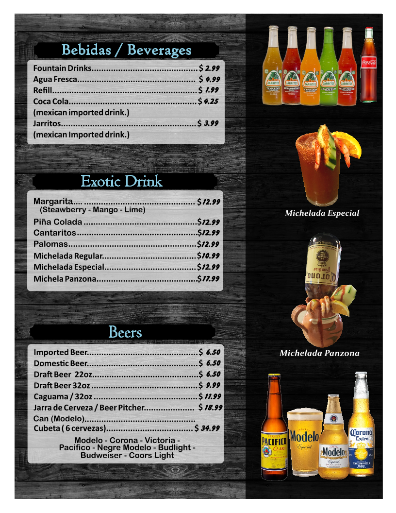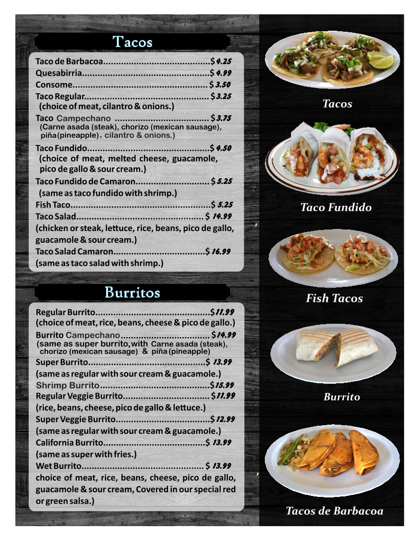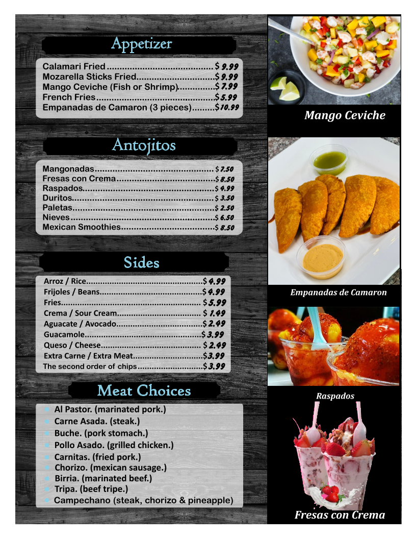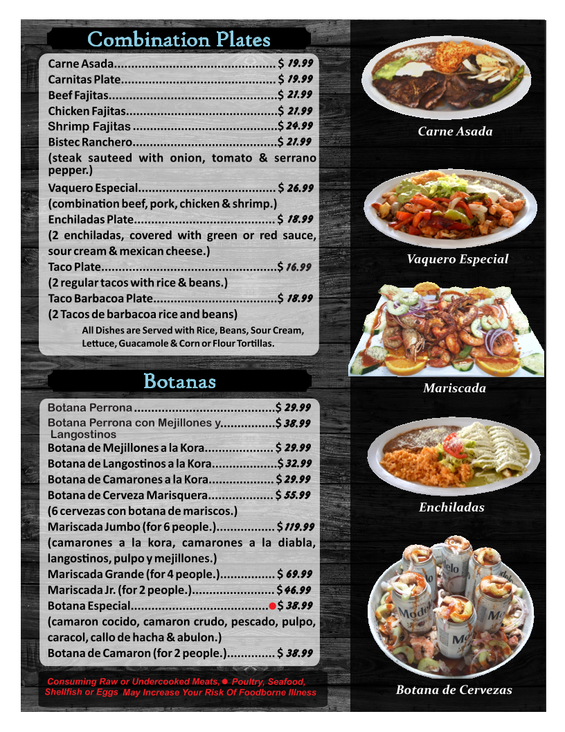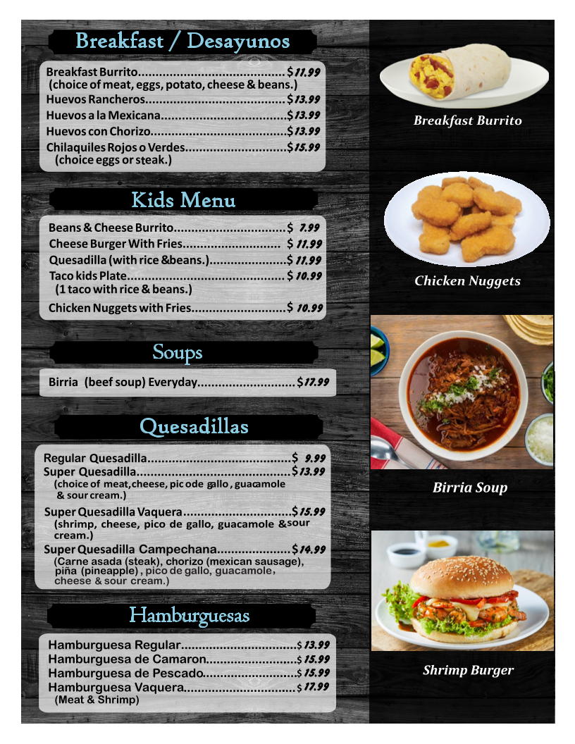 From a reviewer’s perspective, the menu at El Camarón Vaquero offers an extensive variety of Mexican and seafood dishes, making it easy to find something for any craving. The breakfast section features classics like Breakfast Burrito, Huevos Rancheros, Huevos a la Mexicana, Huevos con Chorizo, and Chilaquiles Rojos o Verdes, while the kids menu includes simple favorites such as Beans & Cheese Burrito, Cheese Burger With Fries, Quesadilla Taco Kids Plate, and Chicken Nuggets with Fries. Seafood is clearly the highlight, with soups like Birria and Siete Mares, as well as specialties such as Molcajete, Aguachile Verde o Rojo, and Ostiones Preparados (1 dozen.). Popular seafood entrées include Camarones a la Diabla, Camarones Rancheros, Langostinos a la Kora, and Mojarra Frita. There are also plenty of casual options like Quesabirria, Taco Campechano, Super Burrito, Shrimp Burrito, and combination plates such as Carne Asada, Chicken Fajitas, and Shrimp Fajitas. Appetizers like Calamari Fried, Mozarella Sticks Fried, and Mango Ceviche, along with desserts and snacks like Mangonadas and Fresas con Crema, round out the menu nicely. With a wide selection of drinks including Agua Fresca, Margarita, Piña Colada, and Michelada Regular, the menu feels complete and satisfying, especially for seafood lovers looking for generous variety.