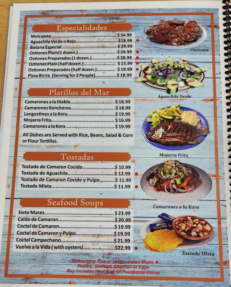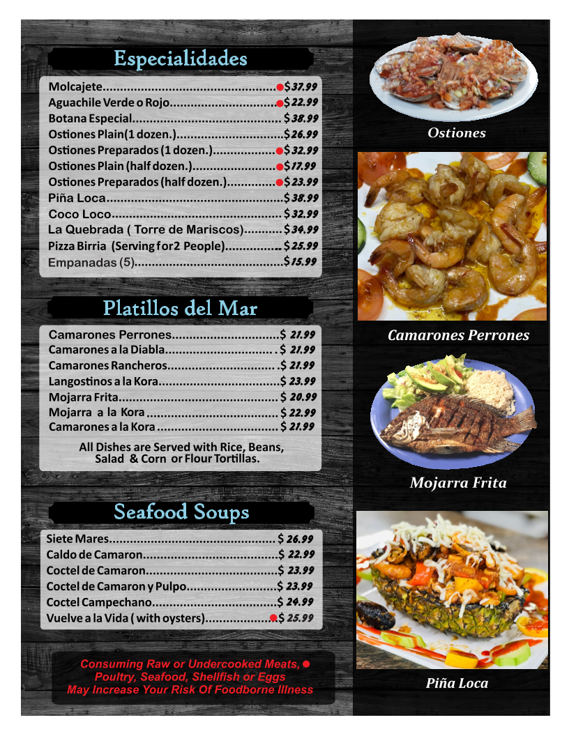 (camaron cocido, camaron crudo, pescado, pulpo, caracol, callo de hacha & abulon.)