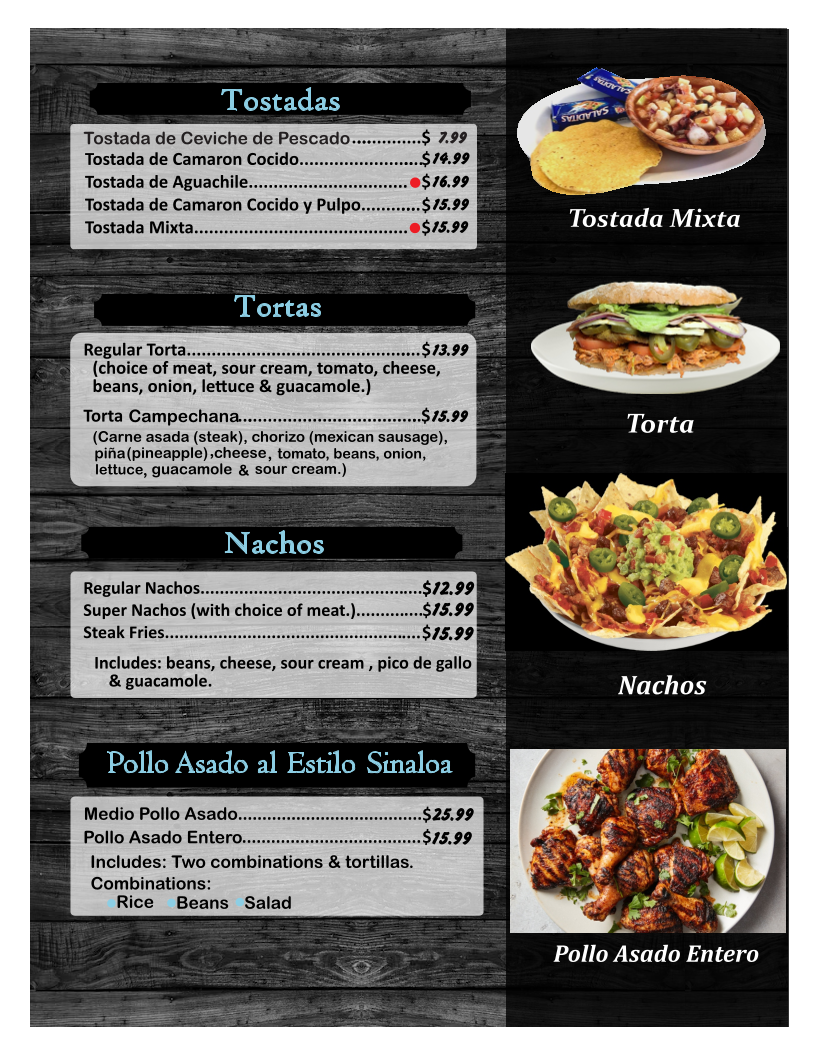 All Dishes are Served with Rice, Beans, Salad & Corn or Flour Tortillas.