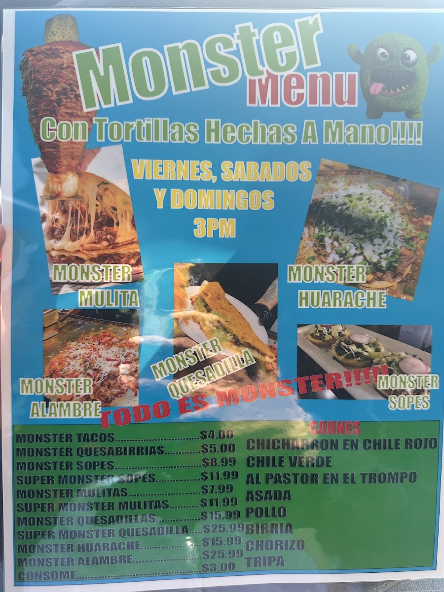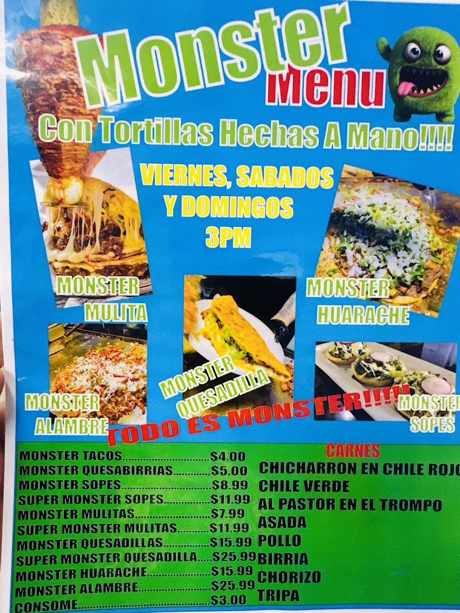 (Carne asada (steak), chorizo (mexican sausage), piña(pineapple),cheese, tomato, beans, onion, lettuce, guacamole & sour cream.)